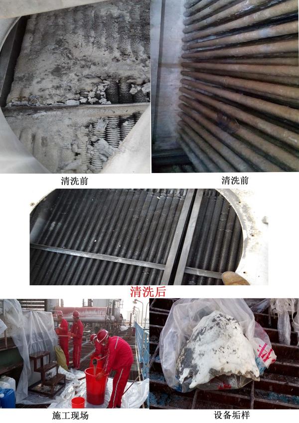 復合型蒸發(fā)式冷卻器上部是風冷式,下部為水冷式。因此上部翅片管束表面由于接觸環(huán)境大氣、易于積存油膩、塵垢、煙垢、柳絮等附著物,形成較大的熱阻,污垢的存在將大大降低甚至喪失鋁翅片冷換設備的冷卻作用。另外鋁翅片表面的污垢也會促使垢下腐蝕。下部水冷式光管表面由于外部環(huán)境條件影響,并且由蒸發(fā)式空冷器的特點,造成循環(huán)冷卻水濃縮快,濃縮倍率高,硬度,堿度高,濁度高等困難。在長期運行過程中,空冷器光管束表面生成了很厚的硬垢,嚴重影響了空冷器換熱效果,增加了能耗,影響了正常生產(chǎn)和安全。為了保證設備安全,穩(wěn)定運行,延長使用壽命,提高冷卻效率,應對其進行定期清洗。